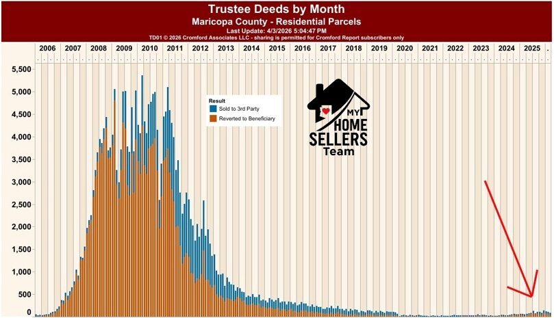 This chart illustrates trustee deed activity in Maricopa County—properties that have gone through foreclosure and either reverted back to the lender (REO) or were purchased by third parties at auction.